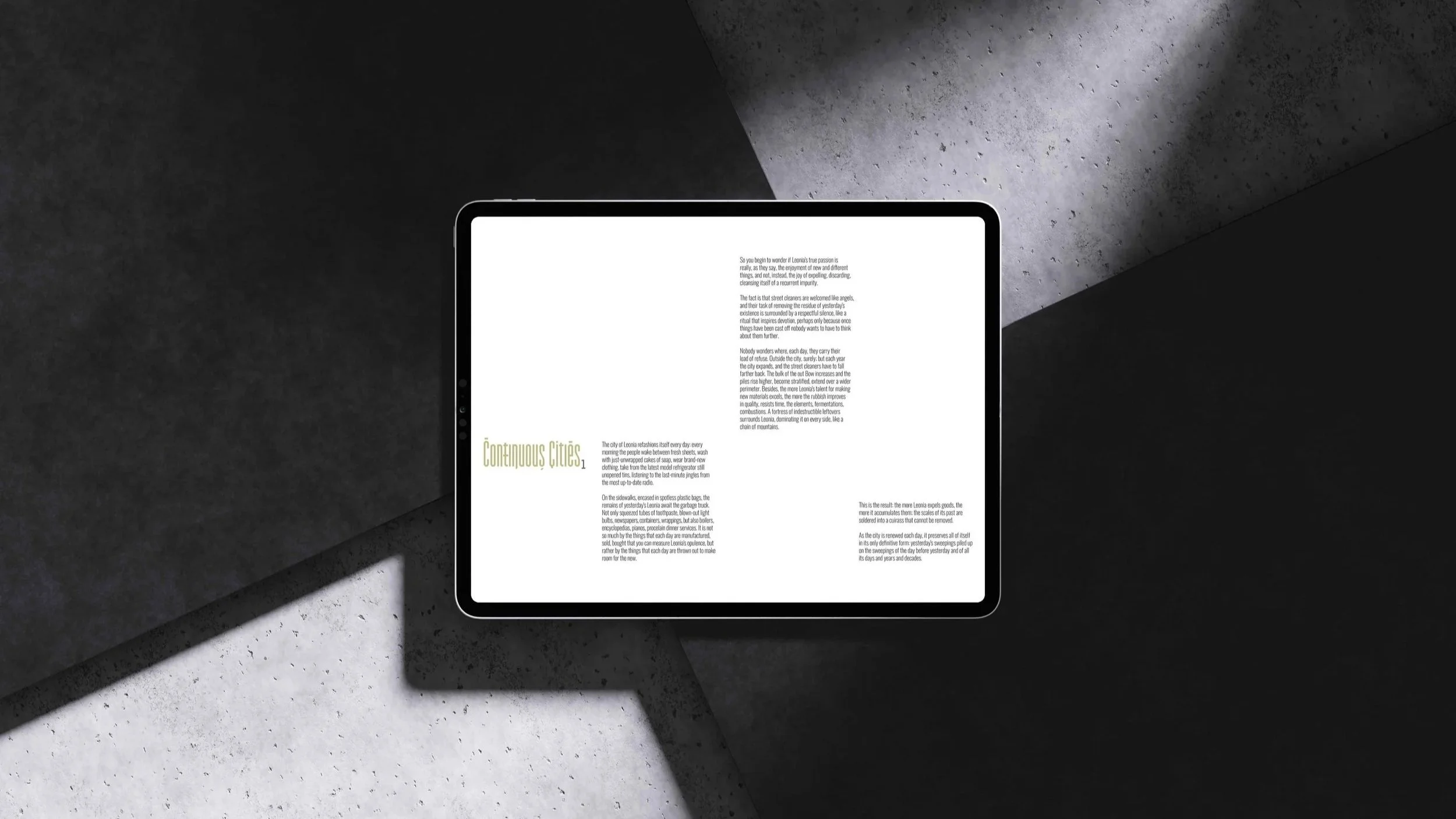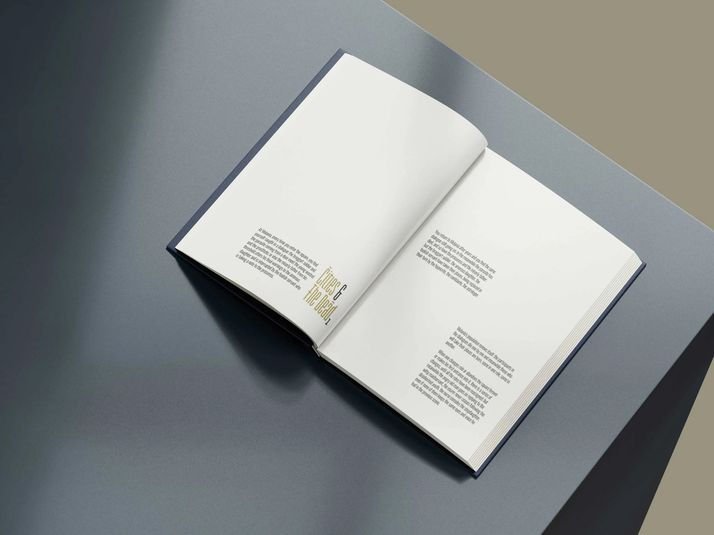 I explored the book’s structure by creating eleven editorial groups, each representing a theme from the narrative. I chose the Garaje typeface for headings to reflect its polyhedral character.